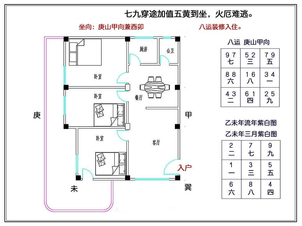 本宅坐庚山甲向兼酉卯,八运双星到向,山星生气在巽宫,开门本是不吉。巽宫七九同到,未方亦七九同到,均处于动气之位,病根暗伏尔,逢客星吊动,恐有火祸。再者坤宫,运星五,山星七,向星九,飞星赋曰:青楼染疾,只因七弼同黄。故会有家人得染下部隐疾。