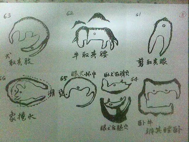 喜鹊噬木横放棺,紫燕归巢顺取气。半月沉江,其光在形;七星堕地,其象在神。美女梳妆,乳中摇动;孩儿坐帐肾内呈详。醉翁跌足,动转无定;仙人脱履,前趾可寻。坐虎咬尾见其尾,狮子戏球看其球。向天铜锣,理取其锣;金磐摇珠,法求其珠。