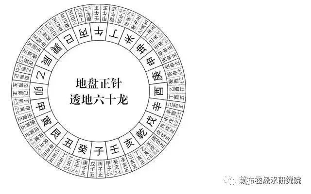 此图是台湾姜威国先生所绘,姜先生是将天盘缝针的二十四山中的每一山分为两格,并以一百二十分金中的“旺、相”两格来命名。据姜先生所说,外分金的主要用途是当正针分金与龙穴未合时,或与龙纳音相互剋泄,或与砂水方位有冲射时,即须从缝针据台湾姜威国先生所说,一般是以“百二十分金”取其旺相而用,但由于仙命纳音与分金纳音或地形地物之五行纳音无法相互配合,故又有采用内分金和外分金之用。“透地六十龙”是依双山为一组,於其下分定五子龙,如此二十四山共十二组(每组五龙),共得六十龙也,其分法见图-5。