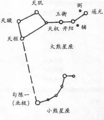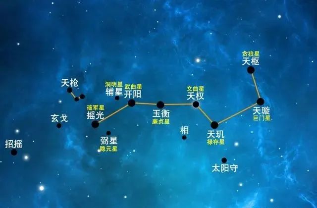 北斗七星在太微北,杓携龙角,衡殷南斗,魁枕参首,是为帝车,运于中央,临制四海,以建四时、均五行、移节度、定诸纪,乃七政之枢机,阴阳之元本也。……又曰一至四为魁,魁为璇玑;五至七为杓,杓为玉衡:是为七政,星明其国昌。第八曰弼星,在第七星右,不见;第九曰辅星,在第六星左,常见。《晋志》,辅星傅乎闿(开)阳,所以佐斗成功,丞相之象也。