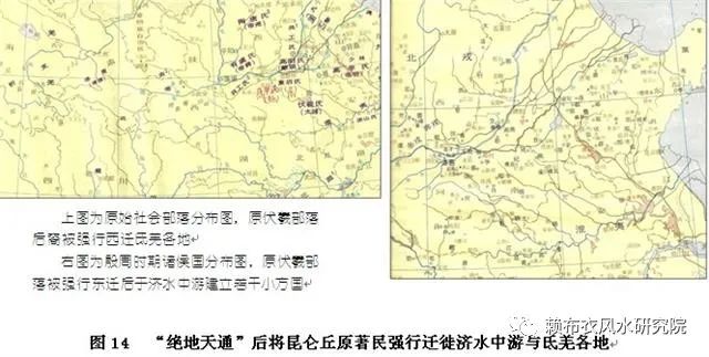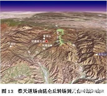 “绝地天通”以后,执掌最高神权(巫师)与最高政权(帝王)的颛顼,为竭力巩固其“中央帝王”的政治地位和“天子祭天地”的神权地位,便强令推行多项举措。其中与祭天、“风水”直接相关的有若干项,例如:其一,祭天道场由昆仑丘转场到天台(坛)山(图13);其二,“好风水”由昆仑神龙顺着中轴龙脉向南延伸至大河(黄河);其三,将原居昆仑丘一带的太皞部落民众强迁至济水中游和氐羌各地(图14)。