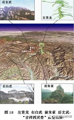 史载伏羲与女娲为风姓,古时风、凤同音同字同义。故可认定风姓氏族原始聚落在昆仑西侧鳌背山南下凤凰台一带。据考察证认,东侧的昆仑丘为传说中龙的原型山体;西侧的不周山为白虎(有称麒麟)的原型山体;南侧的凤凰台为朱雀(凤凰)的原型山体;北侧的鳌背山为灵龟(玄武)的原型山体。于是据《吴书·胡综传》所言:“四灵既布,黄龙处中”推测,龙麟凤龟四灵兽之中央即为伏羲(黄龙)诞生地(图18)。由此,“风水”便认为天皇伏羲诞生地由左青龙、右麒麟,前朱雀、后玄武卫护乃大吉大贵之风水宝地,引申到储君之龙穴当然也应有“四灵兽”护卫方为吉。这便是风水形势宗龙穴“四神砂”说之由来。