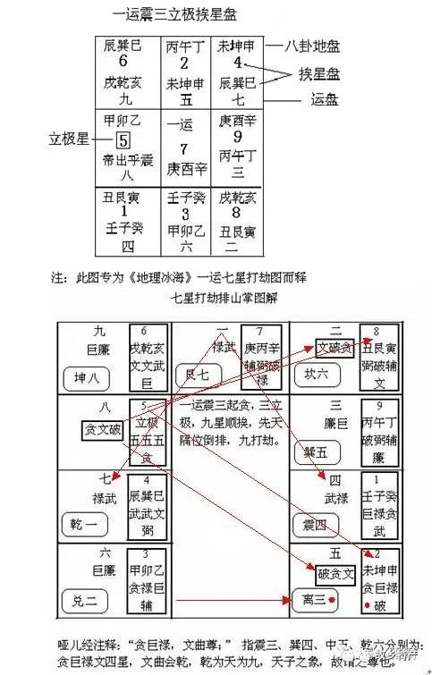 天玉经云,识知父母三般卦,便是真神路,北斗七星打劫,离宫要配合,蒋传云,识得三般父母,己是真神路,犹须哓得北斗七星打劫之法,则三般卦之精髓,方是最上乘之作用也。章氏直解云,父母是易经四位之父母,三般卦是乾至震至离至乾,颠倒颠之三般卦,北斗者随时立极之气也,七星者,由现在逆推到第七位也,此处五行正与立极之气相反,最易发祸,要相合者,使发祸变而发福,再能以山水形气生克制化理气通之,岂非是最上乘之作用乎。