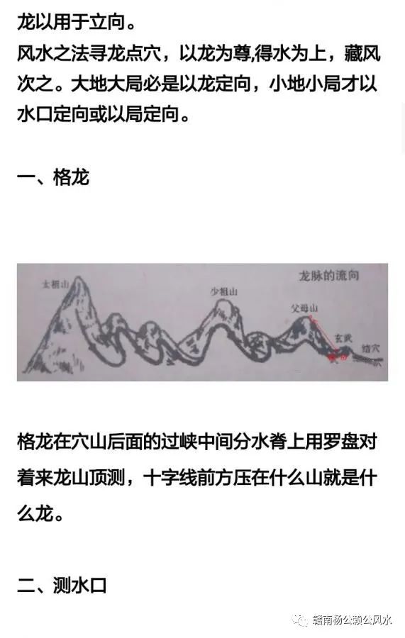 格龙,在穴山后面的过峡中间分水脊上,用罗盘对着来龙山顶测,十字线前方压在什么山就是什么龙。