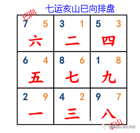 例如:七运之宅立癸山来龙之阳宅风水,以癸山所属子宫相对之宫之午宫起破军龙,因癸山在先天属阳,阳逆飞(如上图所示)。若此屋实际情况只允许在巳宫、午宫、辰宫三内立向开门,因午宫及辰宫挨排俱得凶龙,固只可在巳宫内选向,而巳宫内有巳丙两山,到底选哪一山呢?如选择立巳向,则星盘为上山下水(如下图),又是连珠卦(中州派称连茹格),主大败财,且不利丁口,故不取用。