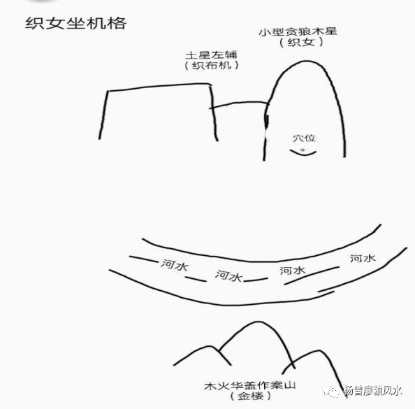 (3)织女坐机格:此格局织女坐机是在织布,这个织女是农家人,平时以织布为业,以贪狼木星作为织女,这个以 土星的左辅作为它的织布机,所以坐机等于是靠在这个织布机的旁边。这美女织的布要送给谁呢?送到金楼里面, 送到富贵人家。所以美女前面是以木火的这种华盖作为案山当金楼,前面要有水来环抱,这样子就能成为织女坐机格。