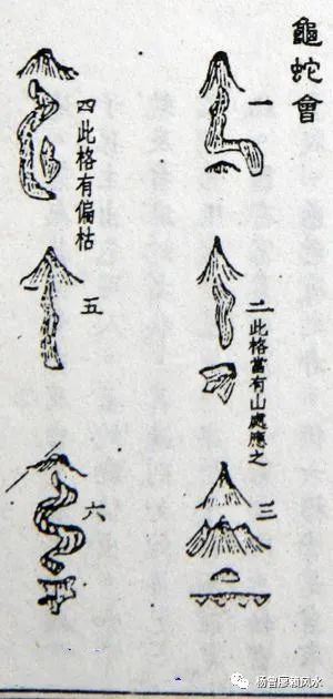 龟蛇会,凡十二格,前六格吉,后六格凶。第二格若高山落平地出蛇,而龟脉相连,则吉,然亦主妻孥怀害夫之心。若高山之上蛇垂地,而与龟脉相连,则谓之悬头,如已斩之头悬吊下垂之状,如更有凶山,主出人处斩枭首。第四格蛇从山角而出,全偏归一边,若无其他贵秀及吉星助之,后代子孙主出乞丐人,盖蛇已偏出,如弄蛇及打麻蛇之状,其龟则如蛇箩乞箩之类,纵有妤星辰,亦恐子孙不能免此。固有富贵之家,一家之内,仕宦贵贱,色色有之者。