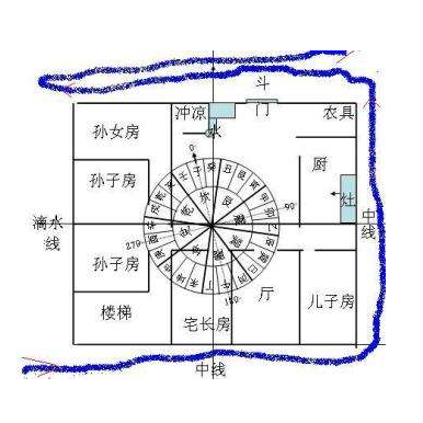 (2)阳宅内部布局爻位:上爻栋墙;五爻香火;四爻坑厕;三爻床柜;二爻厨灶;初爻沟井