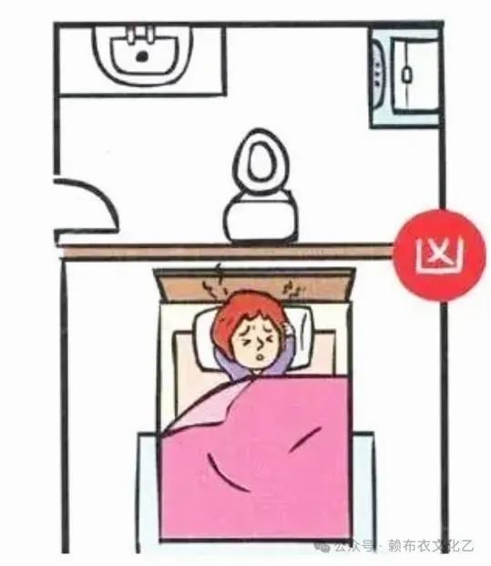 房间里的厕所对到床,情况比房门对到厕所严重:对到头,会头痛、思考时不能集中,住久了容易产生肿瘤、中风等。对到腰,会腰酸、心脏无力、水肿,住久了容易产生糖尿病、心脏病;对到脚,会坐骨酸痛、膝盖无力、痛风水肿,住久了容易产生意外骨折。