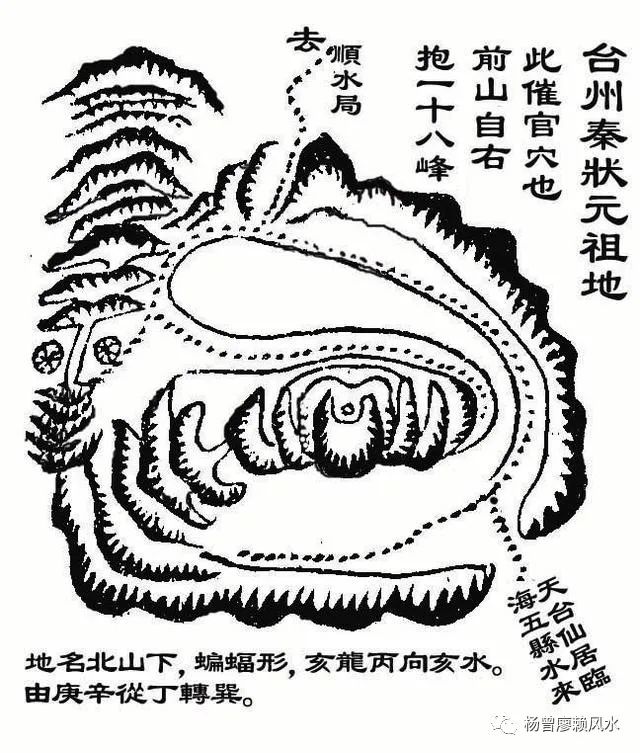 下地在临海治东三十里,地名北山下。其龙来脉甚远,逆水奔行四十里。比入局,大断过峡。峡之左右有墩阜夹护,术家谓之金弹子,贵证也。过峡后顿起高峰,耸秀冲霄。石骨奇异,正脉从石顶中垂落鹅颈百余丈,复起星峰,顿跌数节,直串向西,闪落亥脉,从凹顶脱煞结穴。龙气大旺,入首隐伏,横铺平坦,而无落头之乳。两畔弯抱重重,而皆长出不止,穴情隐拙,又是顺水作向,不入俗眼。亥龙插壬山丙向,俗呼蝙蝠形。后山帐乐,前朝特异,罗城秀列,局势盘旋,龙眞穴隐,如顽石中之美玉,未易察识。但葬时状元已数岁,此催官地耳。秦公鸣雷戊寅生,嘉靖甲辰状元及第,官至礼部尚书。二子懋约、懋勲皆发科,富贵未艾。