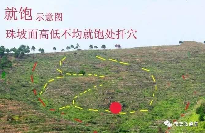就,靠近之意。饱,就是脉气能量最集中的地方。来龙脉气缓慢,虽然得到了似珠宝一样的穴位,但坡面大小不均,就饱满处扦穴。