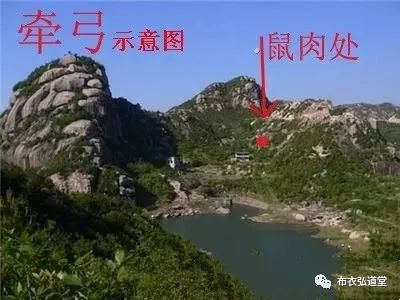 来龙山顶欹(读“七”,倾斜、歪斜之意)斜转向山凹这一侧,就像人用两手拉弓射箭一样的姿势,穴位在“鼠肉处”。 鼠肉是形容词,用力拉弓时胸肌会鼓起来,像个老鼠趴在这个地方,也是拉弓时力量最集中的地方,是射箭能否成功的根本。