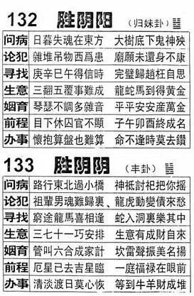 掷卦方法:将两块卦合到一起,右手捏住卦的尖部,稍向上一掷,自然落地,必得上面三种情况其中的一种,掷三次后合成一卦,我们称“三掷灵卦”。如果第一次掷得阴卦,第二次掷得圣卦,第三次掷得阳卦。那么这个合成卦就是“阴圣阳”。然后在后面找出这个合成卦的卦辞,即知结果。