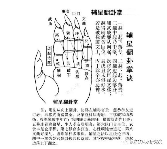 注解:净阴净阳水法可以用辅星翻卦掌法得来。其中贪巨辅武四位来水吉祥,破禄文廉四位来水多凶祸。辅星翻卦掌法如下: