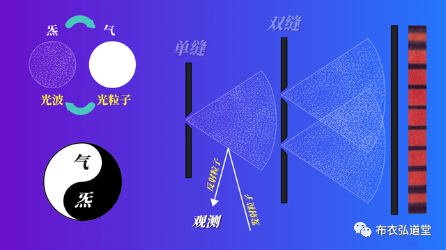 如果用炁与气相互转化的理论,就可以解释双缝实验现象了。光在气的状态属于粒子,在炁的状态属于人类还无法检测到的更精微的粒子群,也就是波。通过粒子发射的反射,才能达到观测的行为,干扰了光的波属性,于是光就呈现出粒子属性。没有观测行为时,光在没有干扰的情况下,能转化以波的形态通过双缝,于是产生干涉,并重新以粒子的形态在探射屏上呈现出明暗条纹相间的可视结果。