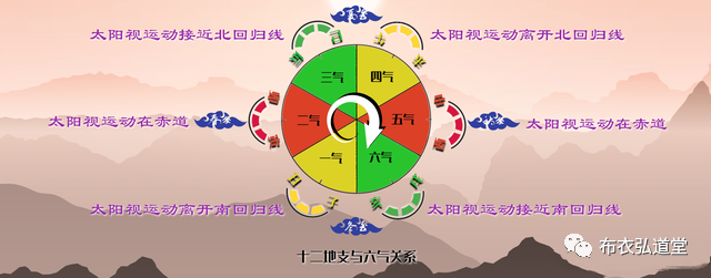 因此,我们知道了:上半年中,子丑在六气中属于冬至,而太阳处在南回归线(午未);寅卯在六气中属于春分,而太阳处在秋分点(申酉);辰巳在六气中属于夏至,而太阳处在北回归线(戌亥)。而下半年中,午未在六气中属于夏至,而太阳处在北回归线(子丑);申酉在六气中属于秋分,而太阳处在春分点(寅卯);戌亥在六气中属于冬至,而太阳处在南回归线(辰巳)。六气的运行与太阳在黄道上或者南北回归线之间的运行是相对的。